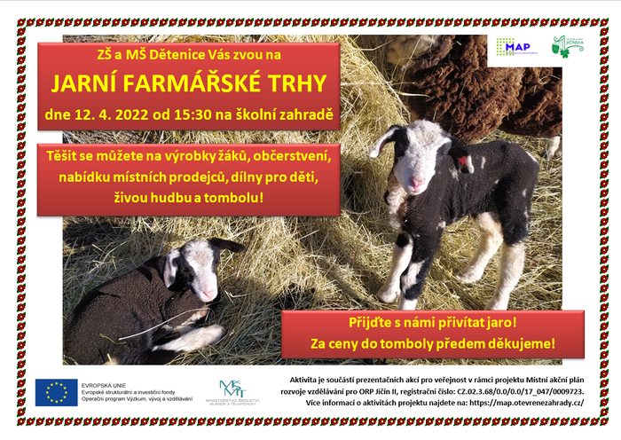 ZŠ a MŠ Dětenice Vás zvou na Jarní farmářské trhy v úterý 12. 4. 2022 od 15:30 hodin.