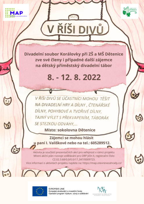 Divadelní kroužek Korálovky při ZŠ a MŠ Dětenice pořádá v termínu 8. - 12. 8. 2022 akci pod názvem V říši divů.