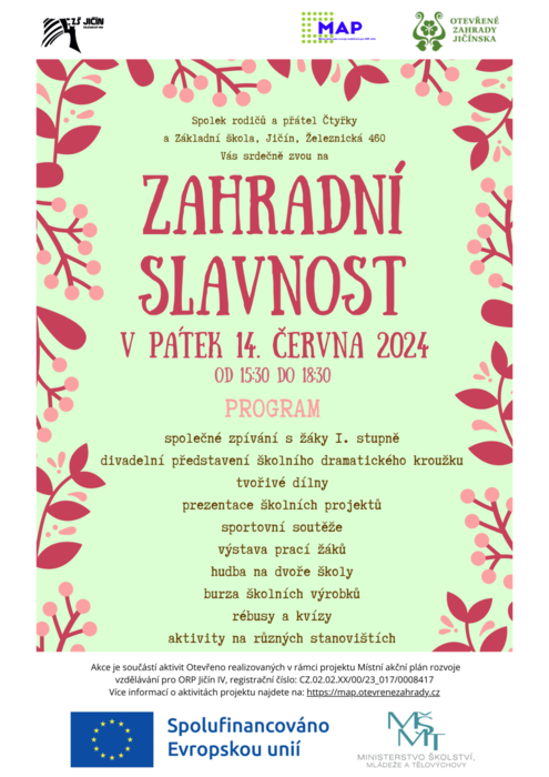 ZŠ Železnická Jičín srdečně zve na Zahradní slavnost, která se uskuteční v pátek 14.6.2024 od 15:30 hodin v areálu školy.