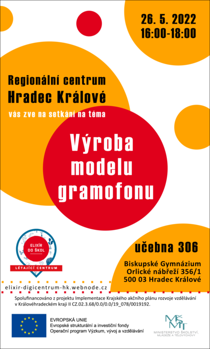 Regionální centrum Hradec Králové pořádá ve čtvrtek 26. 5. 2022 od 16:00 do 18:00 hodin na Biskupském gymnáziu další fyzikální setkání Elixíru do škol, tentokrát zaměřené na výrobu modelu gramofonu a telegrafu.