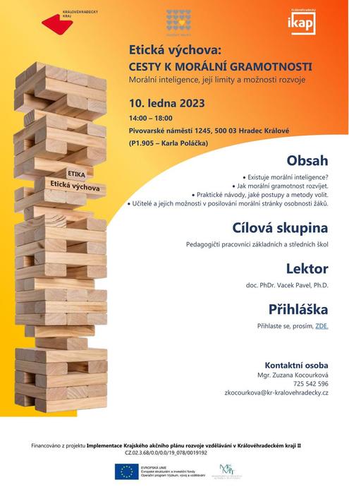 Tým projektu I-KAP KHK II pořádá v úterý 10. 01. 2023 v Hradci Králové v rámci Etické výchovy další seminář tentokrát na téma Cesty k morální gramotnosti.