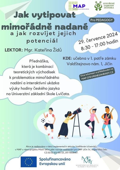 V rámci projektu MAP pro OPR Jičín IV jsme připravili pro pedagogy z území seminář na téma Jak vytipovat mimořádně nadané a jak rozvíjet jejich potenciál, který se uskuteční v pondělí 29. 7. 2024.