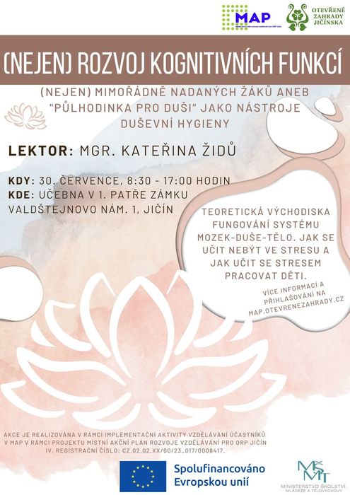 V rámci projektu MAP pro ORP Jičín IV jsme si připravili seminář na téma (Nejen) rozvoj kognitivních funkcí (nejen) mimořádně nadaných žáků aneb "Půlhodinka pro duši" jako nástroje duševní hygieny, který se uskuteční v úterý 30. 7. 2024 od 8:30 do 17:00 hodin.