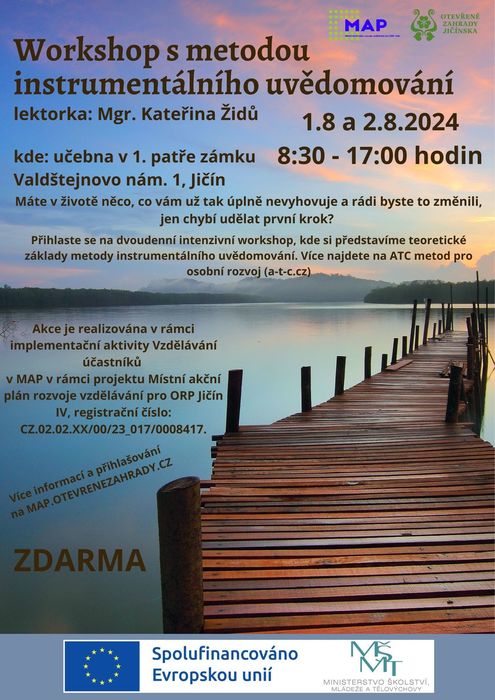 V rámci projektu MAP pro ORP Jičín IV jsme si připravili dvoudenní workshop na téma Metoda instrumentálního uvědomování, který se uskuteční 1. a 2. 8. 2024 od 8:30 do 17:00 hodin.
