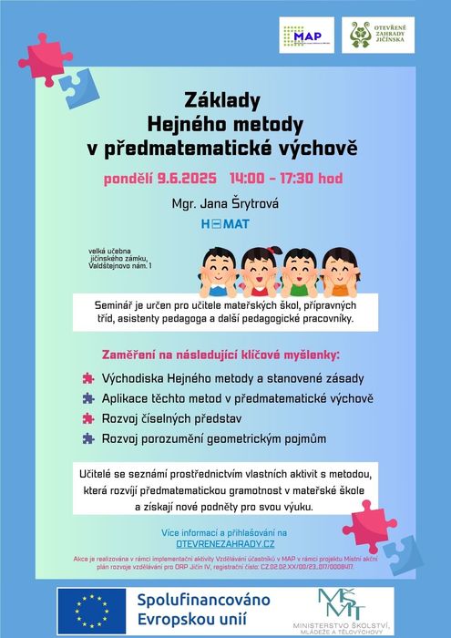 Seminář je určen pro učitele mateřských škol, kteří se již doslechli o výukové metodě prof. Hejného na 1. stupni ZŠ a chtěli by u svých dětí v mateřských školkách efektivně rozvíjet předmatematickou gramotnost v duchu výukové metody orientované na budování schémat.