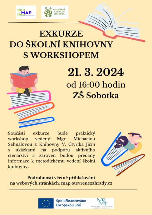V rámci projektu Místní akční plán rozvoje vzdělávání pro ORP Jičín IV realizujeme zážitkový program pro pedagogy: Exkurze do školní knihovny s workshopem zaměřeným na podporu aktivního čtenářství a metodiku vedení školních knihoven.